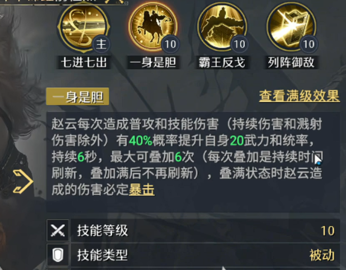 赵云技能七进七出可对目标造成7段武力伤害,并使我方部队一定时间内移动速度提升;固有技一身是胆在每次造成普攻和技能伤害有概率提升自身武力和统率,持续一定时间,可叠加数次,叠满状态时造成伤害必定暴击。