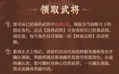 只能从已招募的武将中,选择领取一个