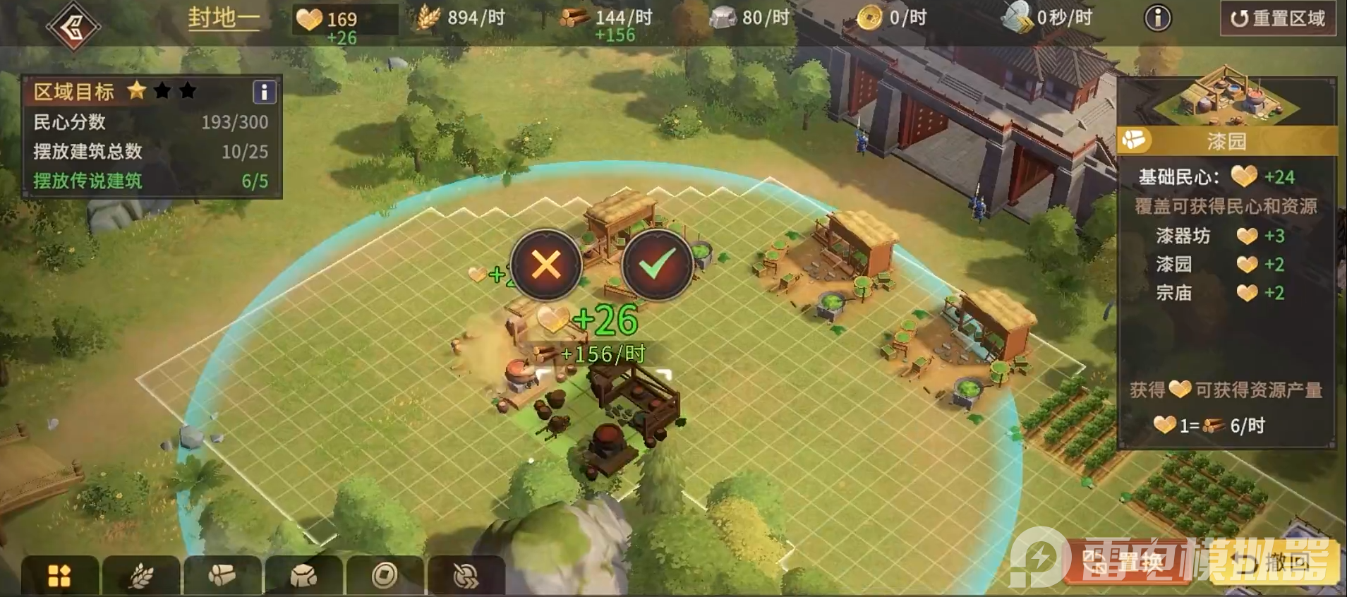 如果有存在配置效率过低的情况,那么还可使用“封地重置”功能一键拆除并重新规划,系统会返还已消耗的图纸,降低试错成本,比如我们可以在拥有伐木场加成的封地上大量建造此类设施,提升资源产出。