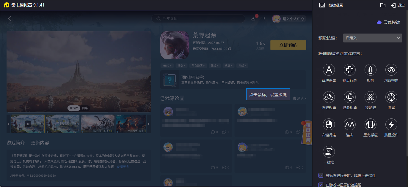 作为主打开放世界生存建造类游戏,玩家若是想要去体验电脑版的话,去选择雷电模拟器来帮自己还是很重要的,作为手游模拟类工具,软件在兼容性方面表现出色,针对安卓手游更是能实现数据方面的完美同步,到时通过“雷电游戏中心”搜索对应作品,然后点击预约即可。