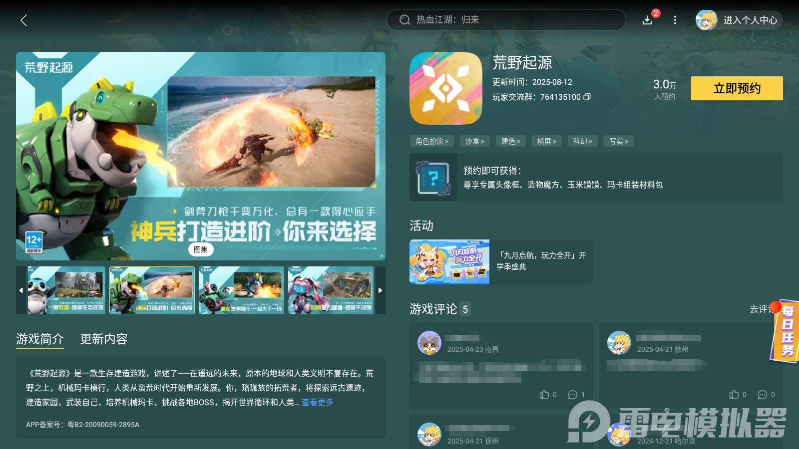 在这里小编推荐大家用雷电模拟器来预约荒野起源,大家可以在官网下载雷电模拟器,然后在雷电中心中搜索荒野起源,点击预约即可。模拟器里面还会有游戏公测的最新消息,而且用雷电模拟器玩,还会有着更好的游戏体验。