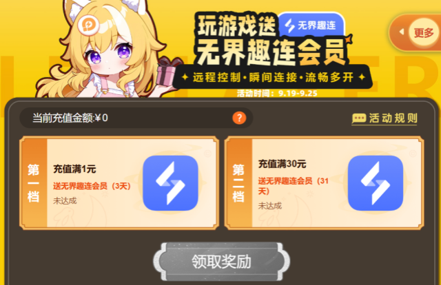 活动规则:雷电玩家在《零度曙光》游戏内实付满1元可领取【无界趣连会员(3天)】的兑换码,实付满30元可领取【无界趣连会员(31 天)】的兑换码。(优惠券和雷币抵扣部分不计入).