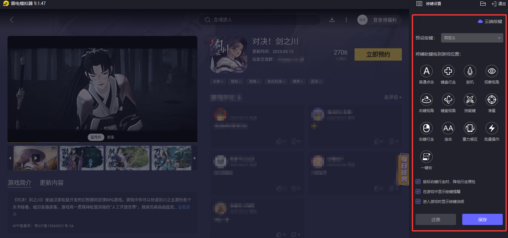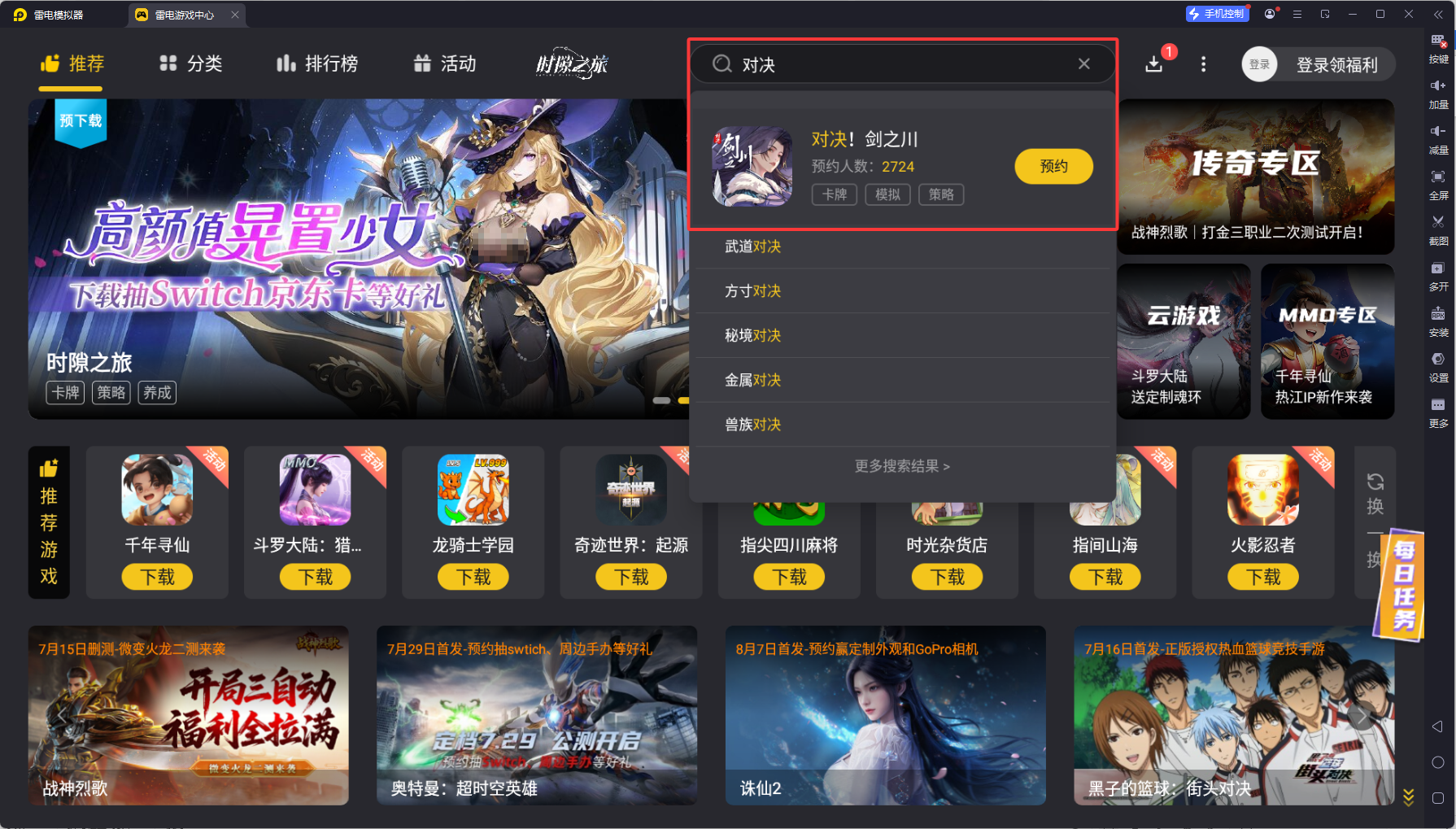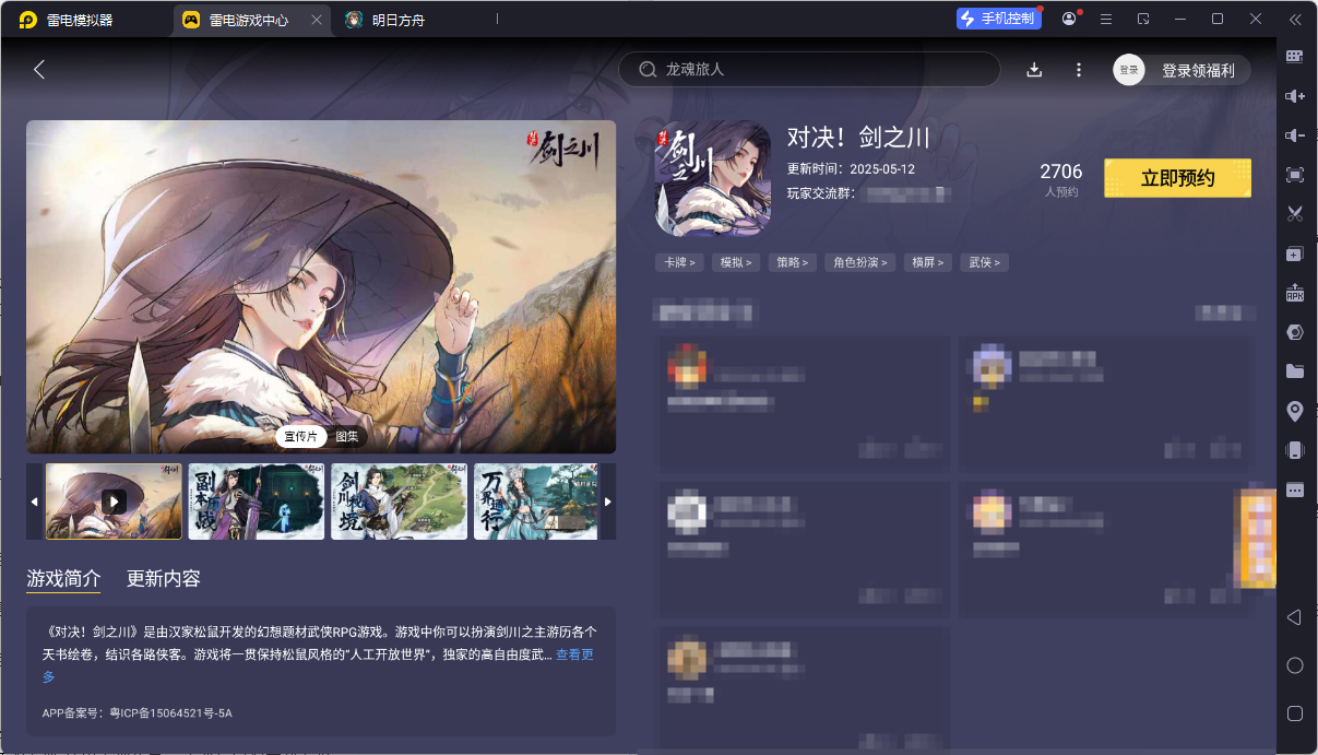 安装完成后,打开雷电模拟器,进入内置的“雷电游戏中心”。在搜索框中输入“对决剑之川”,如果游戏已上架,直接点击下载即可。若游戏尚未开放下载,可以选择预约,待游戏上线后会自动提醒安装。