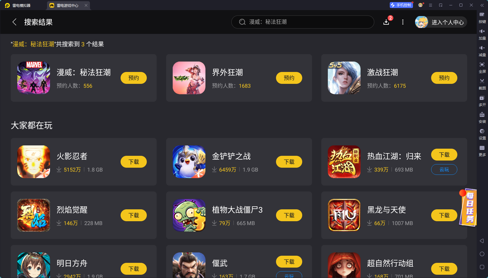 既然要在电脑上玩,那一定要用模拟器啦,在这里小编给大家推荐雷电模拟器。大家可以在官网下载雷电模拟器,然后在雷电中心中搜索漫威秘法狂潮,点击预约即可。而且用雷电模拟器玩还有很多好处呢。