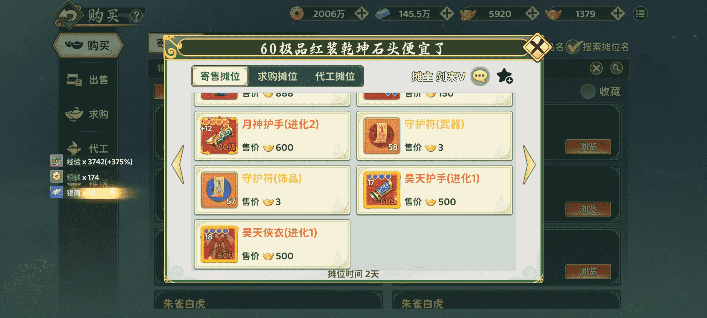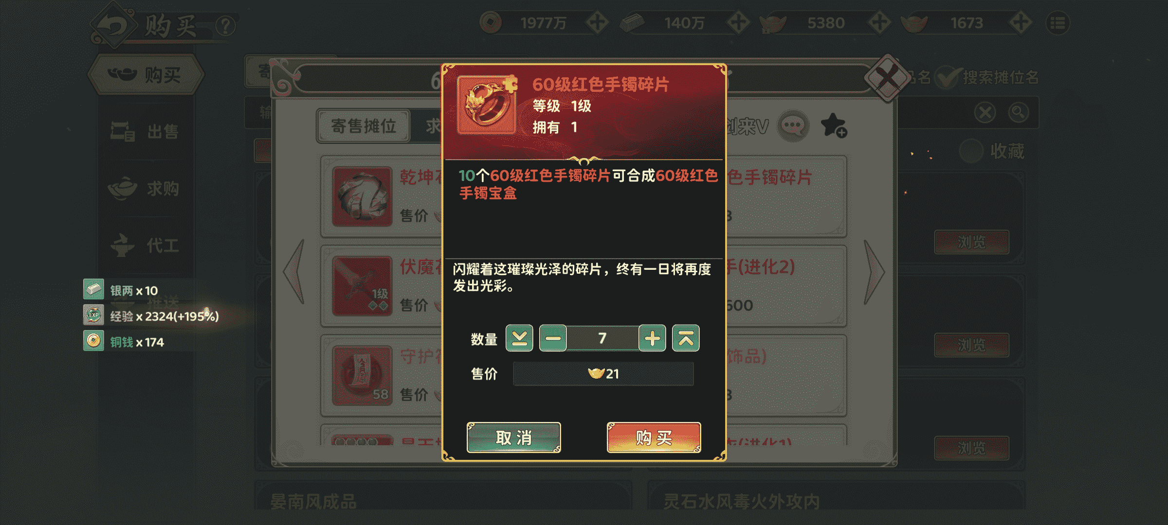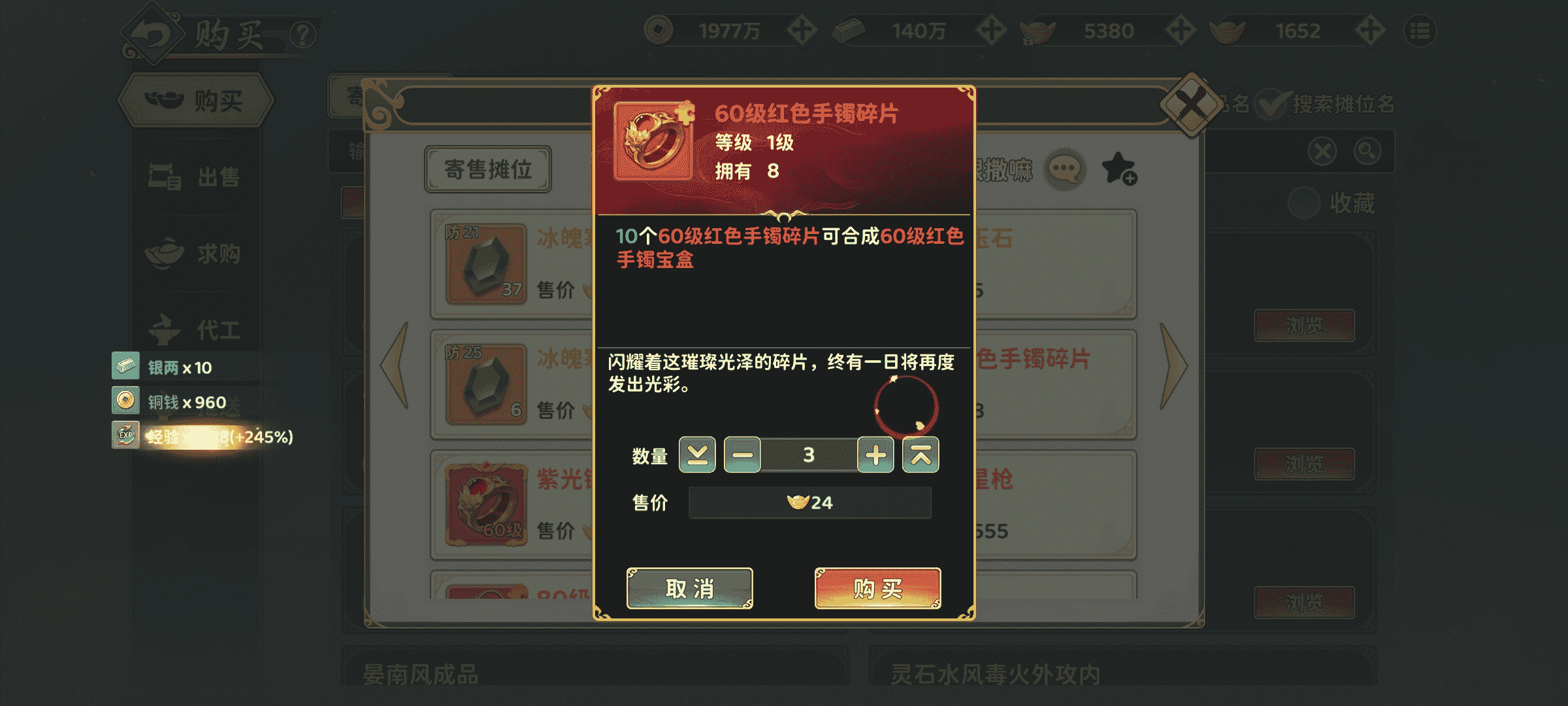 60级红色手镯碎片分两个摊位,最终45元宝拿下,成功合成~