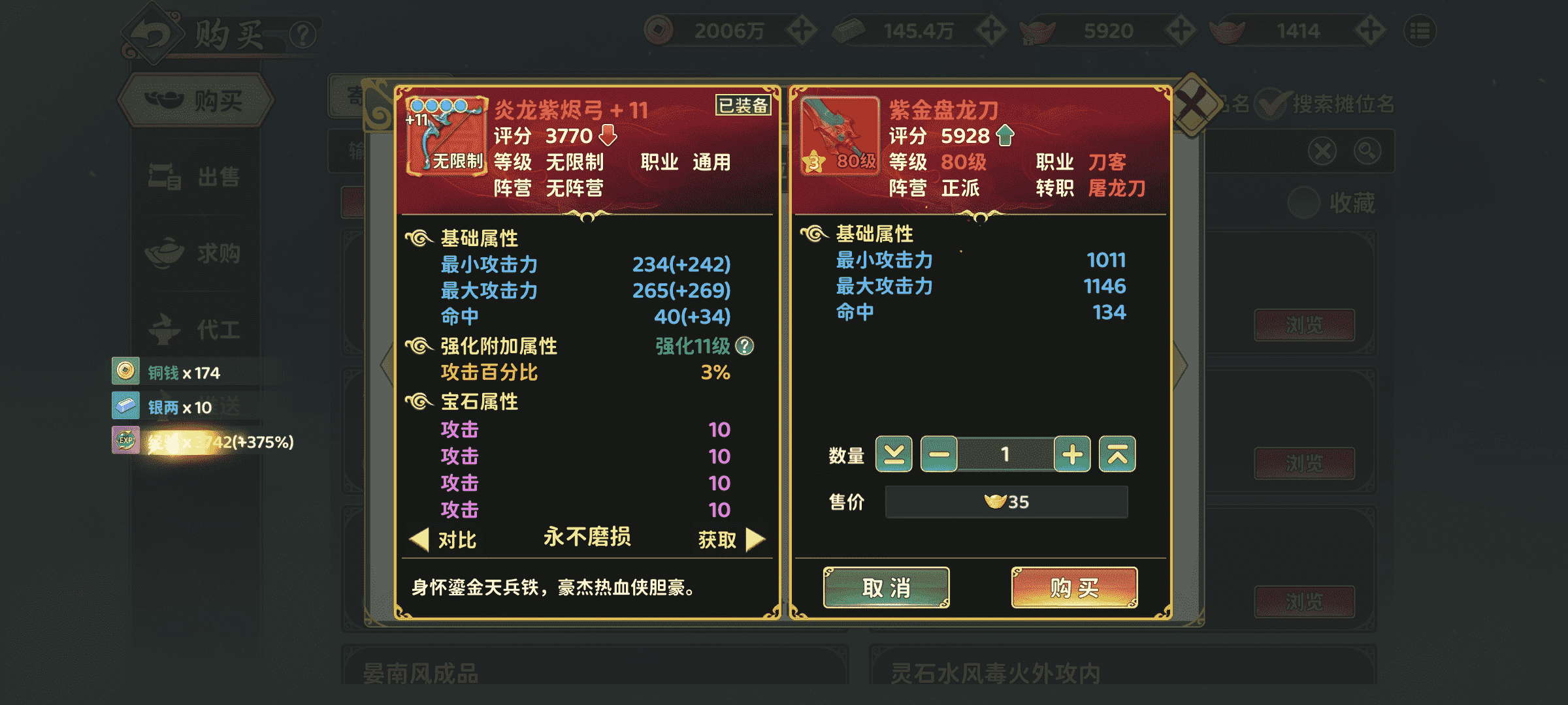 这个80级的紫金盘龙刀我是真馋,35元宝还要什么自行车,我立马切我的刀客存档去拿下了。