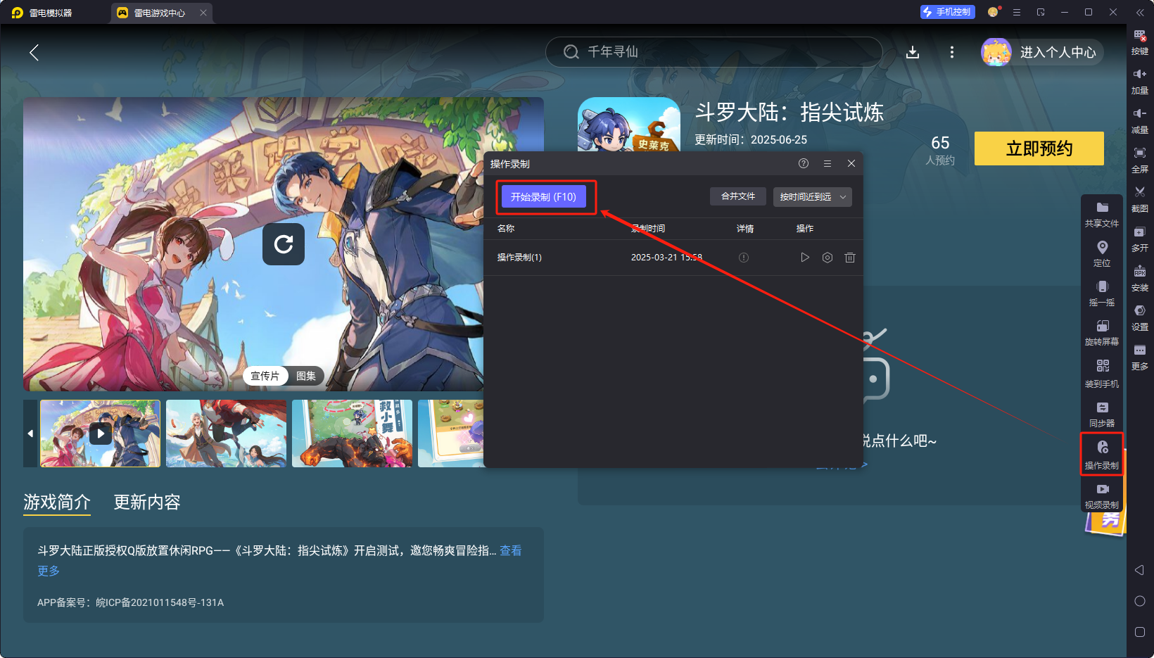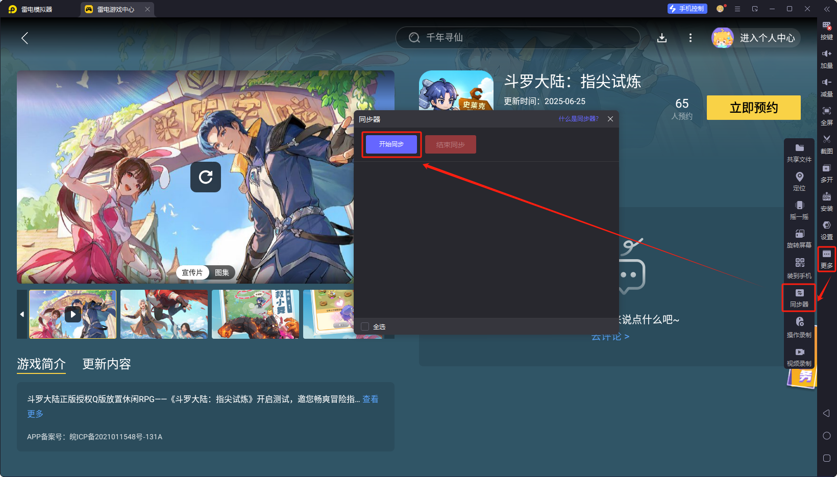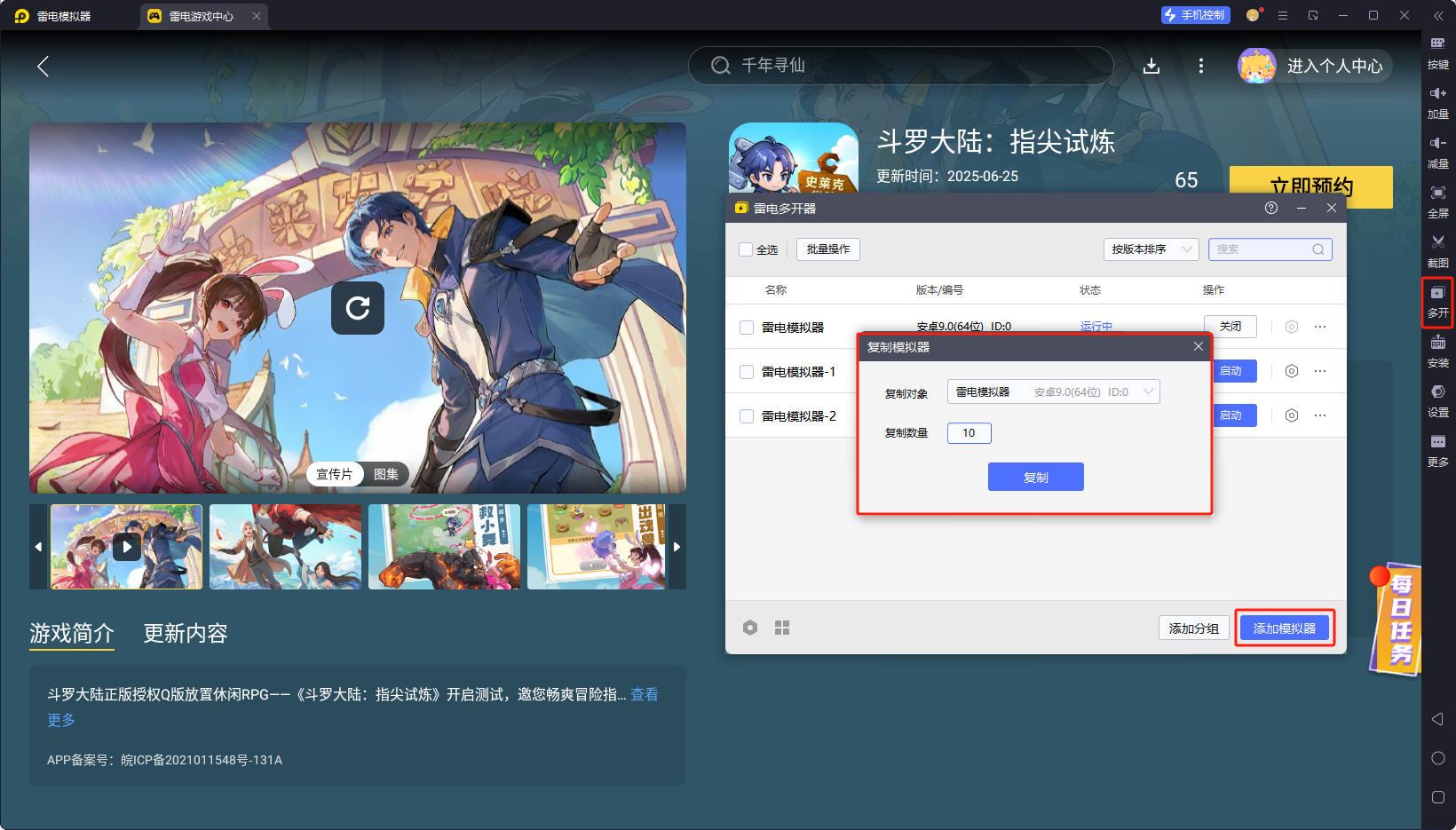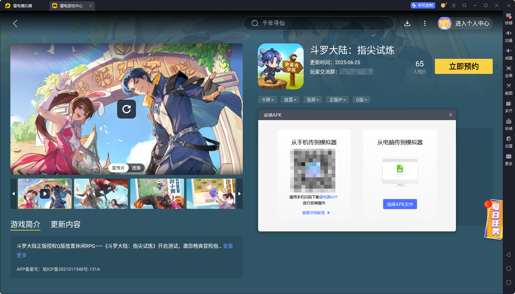 打开模拟器内置 “雷电游戏中心”,搜索 “斗罗大陆:指尖试炼” 直接预约下载官方正版;