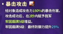 暴击攻击:给对象造成攻击力 150% 的暴击伤害;攻击成功后,在 2 秒内赋予我军 “牢固盾牌 5 级”,最终防御力提升 25%。