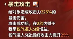 暴击攻击:给对象造成攻击力 225% 的暴击伤害;攻击成功后,在2秒内赋予我军“锐气逼人5级”增益,最终攻击力提升25%。