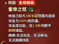 主动技能:雷帝之怒,给自己前方3米半圆范围内造成攻击力250%的伤害;攻击成功后,在 1.5 秒内赋予敌人“麻痹减益”,无法攻击、无法移动、无法施展技能。